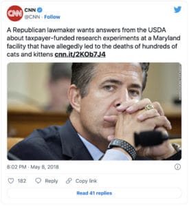This morning, Congressman Mike Bishop (R-MI)–who has been at the forefront of efforts to end taxpayer-funded animal experiments, including investigating government laboratories’ use of dogs and cats–sent a strongly-worded letter to USDA Secretary Sonny Perdue criticizing the kitten tests and demanding answers.