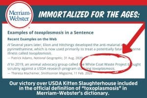 Over one million WCW supporters called on USDA to stop the testing and release the cats. WCW’s first amendment lawsuit compelled the State of Maryland to run our eye-catching bus and train ads criticizing the testing. And our open records lawsuit forced USDA to turn over documents about its “kitten slaughterhouse.”