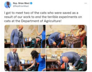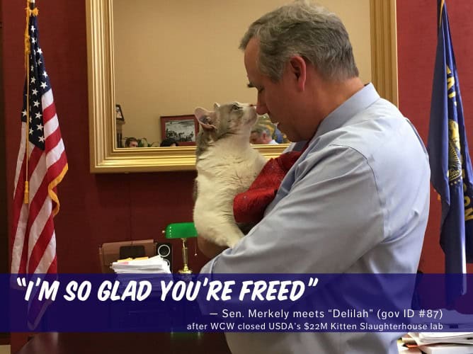 Last week, as first reported by NBC News, the WCW team brought Petite and Delilah, two of the breeder cats retired by the USDA, to visit KITTEN Act leaders Senator Jeff Merkley (D-OR) and Congressman Brian Mast (R-FL). Delilah immediately warmed to Sen. Merkley, who told her, “I’m so glad you’re freed.” Rep. Mast told us, “it’s nice to have you bring them in here, and to see the results of a little bit of the work that we got to do out there.”