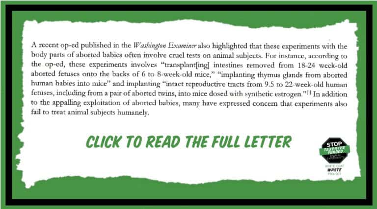 WCW and PLSF uncovered hundreds of taxpayer-funded experiments in which tissues and organs from aborted fetuses were implanted into animals for inhumane and unnecessary experiments opposed by most Americans. As WCW and PLSF wrote in the recent op-ed: