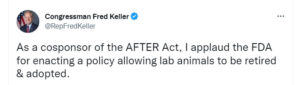 The FDA move comes after more than 1.2 million WCW advocates joined the #GiveThemBack campaign and asked the agency to retire lab animals. The policy breakthrough also follows the introduction of the AFTER Act in the House by Reps. Brendan Boyle (D-PA), Jackie Walorski (R-IN), and in the Senate by Susan Collins (R-ME), and Gary Peters (D-MI). The bipartisan bill would require all federal agencies to allow lab survivors to be adopted out to taxpayers or retired to sanctuaries.