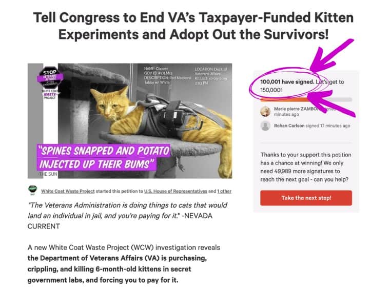 You can’t ignore this roar: More than 100,000 taxpayers have signed our petition demanding the Dept. of Veterans Affairs (VA) stop its wasteful, cruel, and extremely disturbing kitten experiments and adopt out the survivors.