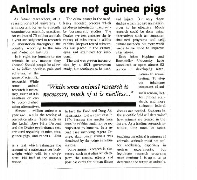 In 1987, while a student at Case Western Reserve University in Cleveland, Administrator Wheeler wrote a great op-ed for the student paper titled “Animals are not guinea pigs”—in which he argued for a reduction of animal testing, on the grounds that it is unethical to experiment on animals merely to meet government demands.