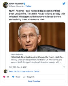 The Daily Caller broke the story on August 4, 2021: Fauci-Led Agency Funded Abusive Animal Experiments Promising To Kill Dozens Of Beagles