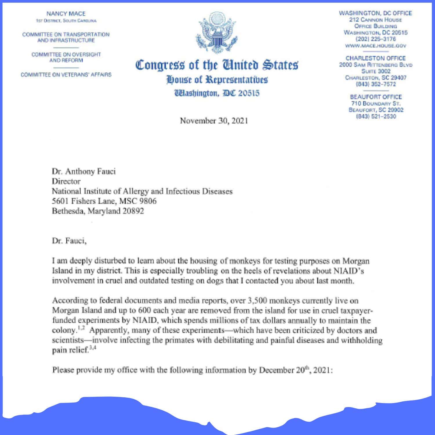 After WCW investigators revealed the dark secrets of ‘monkey island’ — such as the fact that hundreds of monkeys are taken from the island every year, and then subjected to some of the government’s cruelest, most painful experiments, including being infected with Ebola virus — Rep. Mace demanded information from Dr. Fauci, whose division of the NIH owns the monkeys, bankrolls the island, and is responsible for these primate atrocities.