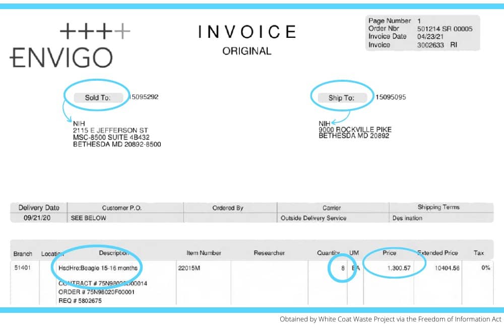 White Coat Waste Project (WCW) has obtained exclusive documents via Freedom of Information Act (FOIA) requests revealing that one National Institutes of Health (NIH) lab has purchased over seven dozen beagles from Envigo since 2019 alone, some as young as one year old, at a cost to taxpayers of between $1,000 and $1,500 per dog.