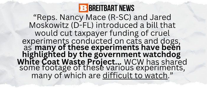 Citing White Coat Waste Project (WCW) investigations, last week Reps. Nancy Mace (R-SC) and Jared Moskowitz (D-FL) introduced the Preventing Animal Abuse and Waste (PAAW) Act to defund all of the National Institutes of Health’s painful experiments on dogs and cats and require more transparency and accountability about all its testing on pets.