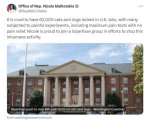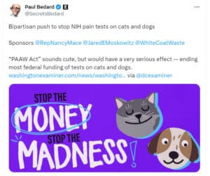 The PAAW Act’s lead sponsor, Rep. Nancy Mace, even posted a tweetstorm highlighting several of WCW’s investigations exposing the NIH’s wasteful and cruel experiments on dogs and cats: