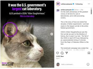 Five years ago, a WCW campaign shut down the government’s largest cat experimentation lab, the U.S. Department of Agriculture’s Kitten Slaughterhouse. Our effort saved over two dozen cats from certain deaths and got them placed into loving homes, including with our president and founder.