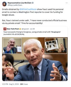 Now, as first reported by the New York Post, we’ve uncovered evidence that Fauci broke federal law by using his personal email to evade Freedom of Information Act requests about Beaglegate and lied to Congress under oath about it.