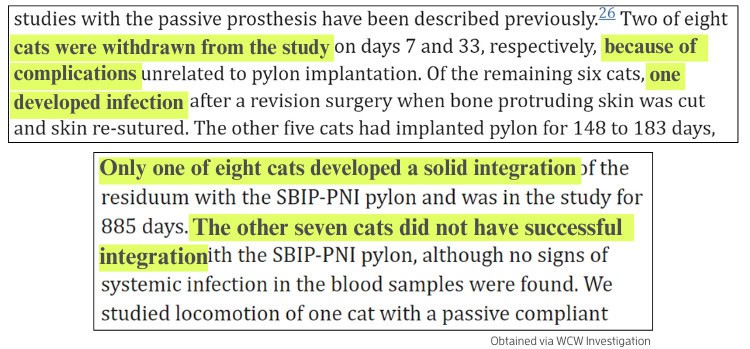 These amputations have resulted in several complications in cats– and are often performed in vain. The process used by white coats in one experiment was so ineffective that only one of the eight cats received a successful implantation.