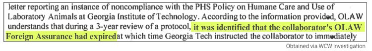 To make matters worse, WCW discovered that Georgia Tech’s Russian partner conducted this cat torture illegally. The Pavlov Institute of Physiology did not have US Government approval to conduct taxpayer-funded animal experiments, and Georgia Tech was cited for improperly collaborating with them.