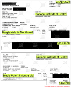 Invoices and other NIH documents secured by WCW show that this NIH lab purchased 4 beagles in April 2024 and another in June 2024. Lab records detail how all were abused in the deadly experiments the NIH just shut down.