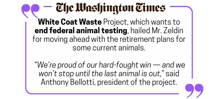 White Coat Waste led the only bipartisan campaign that united Congressional Republicans and Democrats to pass legislation directing the EPA to restore its phase-out timeline and retirement plans. From the beginning of the Trump Administration to today, White Coat Waste has been leading the campaign to cut EPA’s wasteful spending and to retire EPA’s lab survivors. We’re proud of our hard-fought win—and we won’t stop until the last animal is out.”