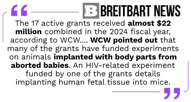 As first reported by Breitbart, a new White Coat Waste investigation has exposed how the National Institutes of Health (NIH) is still funding disturbing experiments where parts of aborted human fetuses are implanted into lab animals.