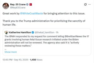 UPDATE (9/10/25): Less than a day after White Coat Waste’s new investigation exposing active NIH funding for wasteful animal experiments using human fetal tissue, the NIH has responded and confirmed, “The referenced grants, initiated under the Biden administration, will not be renewed.”