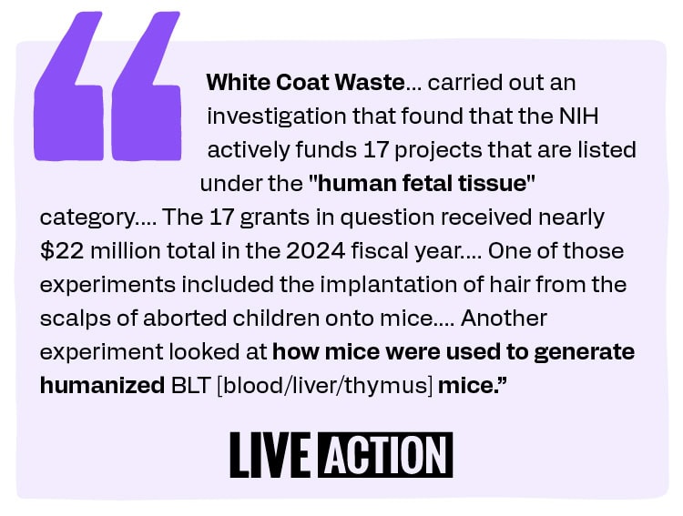 - Less than 24 hours after a new White Coat Waste (WCW) investigation exposed how the National Institutes of Health (NIH) is still funding disturbing experiments where parts of aborted human fetuses are implanted into lab animals, the agency has stated it will not renew the taxpayer-funded grants.