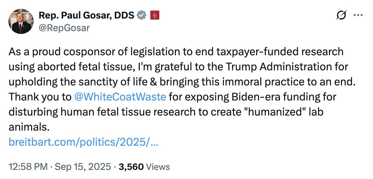 - WCW is urging President Trump, Congress, and Health Secretary Robert F. Kennedy, Jr. to enact a government-wide ban on funding for fetal tissue experiments on animals.
