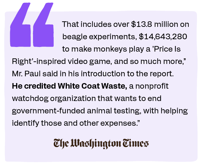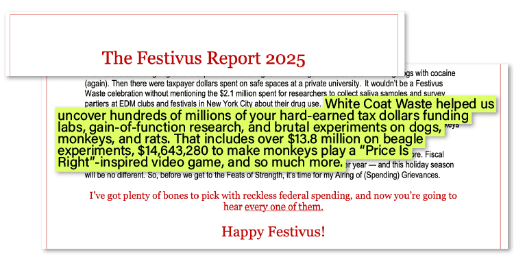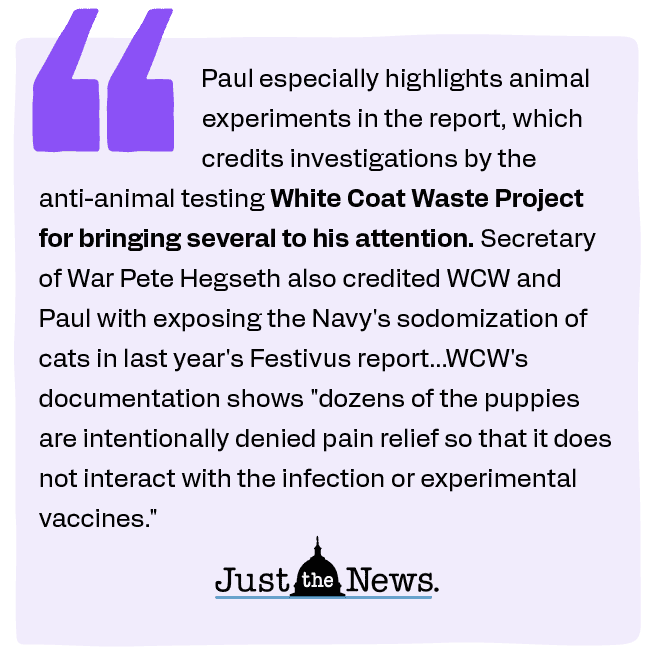 The introduction to Sen. Paul’s 2025 installment of the Festivus report reads: “White Coat Waste helped us uncover hundreds of millions of your hard-earned tax dollars funding labs, gain-of-function research, and brutal experiments on dogs, monkeys, and rats. That includes over $13.8 million on beagle experiments, $14,643,280 to make monkeys play a “Price Is Right”-inspired video game, and so much more.”