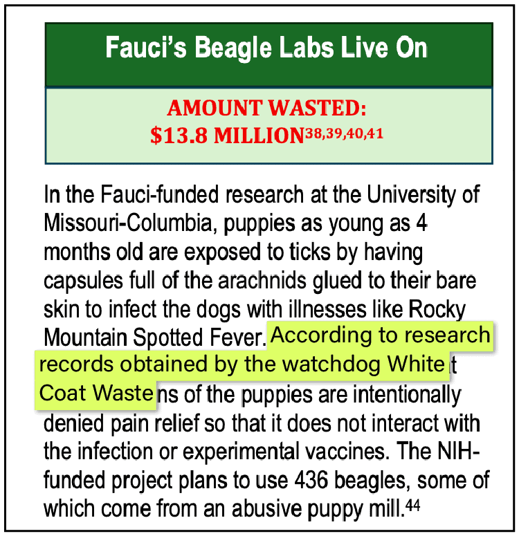 Sen. Paul also revisits WCW’s Coke Hounds investigation, which he included in his 2022 Festivus Report and highlighted in a Senate floor speech on wasteful spending. Back then, the NIH’s cocaine tests on beagles had only wasted $2.3 million. Records obtained by WCW reveal that the price tag on that ongoing project is now up to a cool $5.2 million—and the NIH has added methamphetamine injections to the mix.