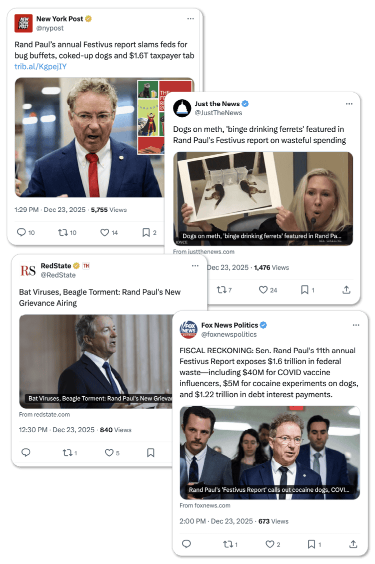 Senator Rand Paul’s (R-KY) Festivus Report, which lampoons ridiculous government spending, has become an annual tradition—as has his habit of spotlighting needless animal experiments exposed by White Coat Waste (WCW). This year—for the seventh year in a row—is no different, and it’s going VIRAL!
