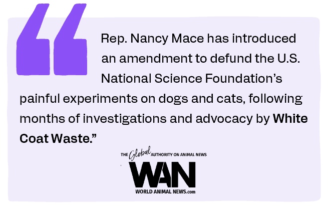 • Following White Coat Waste’s (WCW) investigations, Rep. Nancy Mace (R-SC) has introduced an amendment to defund the National Science Foundation’s (NSF) painful dog and cat experiments.