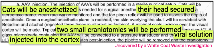 Even worse, this project is led by a faculty member who has been conducting deadly cat experiments since at least 1996. He established his own experimental cat breeding colony because commercial vendors were “unreliable and expensive.”