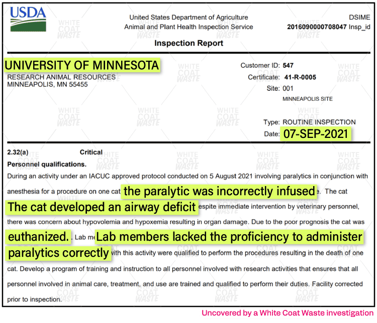 In September 2021, a federal inspection reported a serious incident at UMN’s lab in which a cat was given a paralytic agent at 4.5 times the intended dose, resulting in airway failure and death.