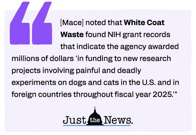 Mace’s letter came days after independent journalist Laura Loomer reported on a new WCW analysis of federal grants indicating that, while NIH is still renewing existing grants funded dog and cat labs, it has apparently not funded any new dog and cat experiments in fiscal year 2026. Loomer also reported that sources tell her the NIH is preparing a formal announcement on dog and cat testing soon.