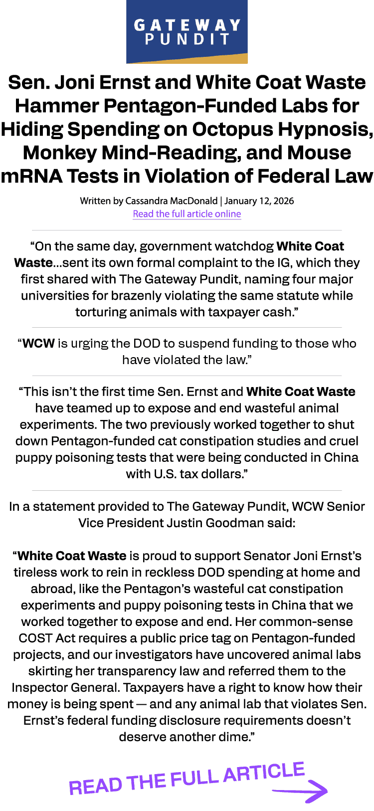 White Coat Waste (WCW) and Sen. Joni Ernst (R-IA) have joined forces and filed formal complaints with Department of Defense (DOD) Inspector General Platte Moring, documenting Pentagon-funded animal labs that failed to publicly disclose their taxpayer funding as required under Sen. Ernst’s 2021 federal law, the COST Act. Read WCW’s complaint and Sen. Ernst’s letter to the Inspector General.