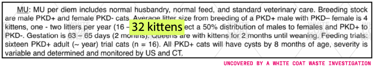 Another recent NIH-funded experiment at UMC intentionally bred cats to suffer from polycystic kidney disease (PKD), a painful, debilitating genetic condition that causes fluid-filled cysts to develop in the kidneys and progressively deteriorates organ function.