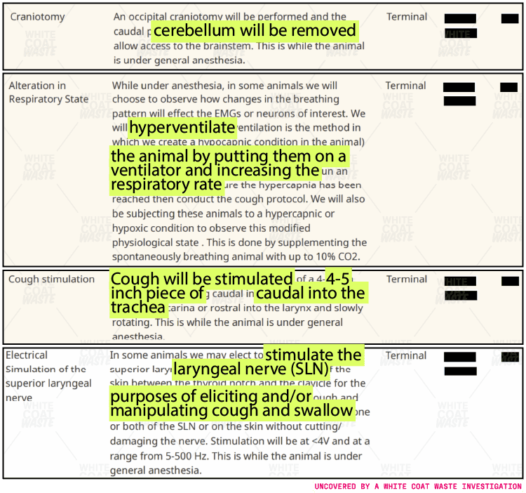 In these experiments that are currently funded through April 2026, cats are deliberately inflicted with spinal cord injuries. Then, their skulls are cut open, and they’re forced to hyperventilate through ventilators pumped with carbon dioxide, cough with tubes in their throats, and endure painful shocks delivered directly to their voice boxes.