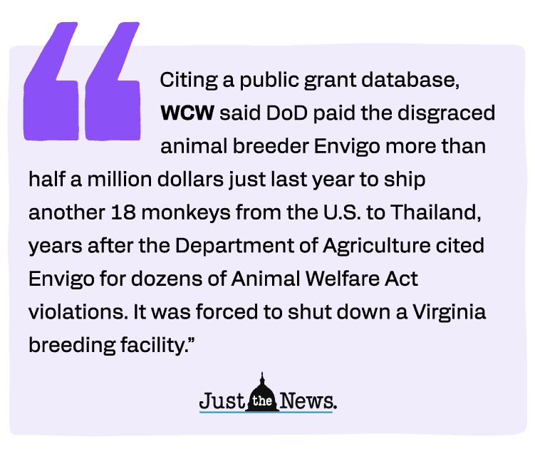 Last year, the Pentagon even paid disgraced animal breeder Envigo $568,510 to ship 18 more monkeys from the U.S. to Thailand for testing.